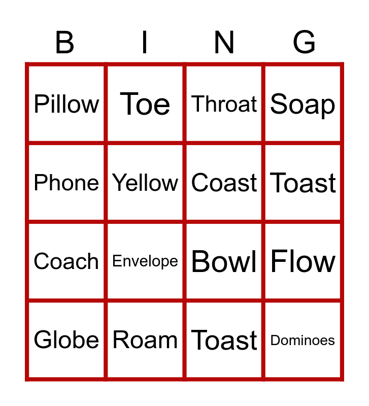 This bingo card has 16 words: Roam, Flow, Throat, Pillow, Coach, Toe, Bowl, Toast, Phone, Yellow, Globe, Soap, Envelope, Toast, Coast and Dominoes.