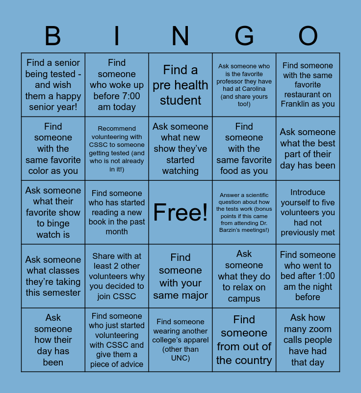 This bingo card has a free space and 29 words: Ask someone how their day has been, Find out someones favorite new hobby during COVID, Find someone who has started reading a new book in the past month, Find a first year student being tested, Find a senior being tested - and wish them a happy senior year!, Find a pre health student, Recommend volunteering with CSSC to someone getting tested (and who is not already in it!), Share with at least 2 other volunteers why you decided to join CSSC, Answer a scientific question about how the tests work (bonus points if this came from attending Dr. Barzin’s meetings!), Find someone who just started volunteering with CSSC and give them a piece of advice, Introduce yourself to five volunteers you had not previously met, Ask how many zoom calls people have had that day, Find someone wearing another college’s apparel (other than UNC), Find someone from out of the country, Ask someone what the best part of their day has been, Wish someone a good midterm season, Find someone with your same major, Ask someone what classes they’re taking this semester, Find someone with the same favorite restaurant on Franklin as you, Ask someone what their favorite show to binge watch is, Ask someone what they do to relax on campus, Ask someone where their favorite place to study on campus is, Find someone with the same favorite food as you, Find someone with the same favorite color as you, Ask someone who is the favorite professor they have had at Carolina (and share yours too!), Find someone who woke up before 7:00 am today, Find someone who went to bed after 1:00 am the night before, Ask someone what new show they’ve started watching and Ask someone what new book they’ve started reading.
