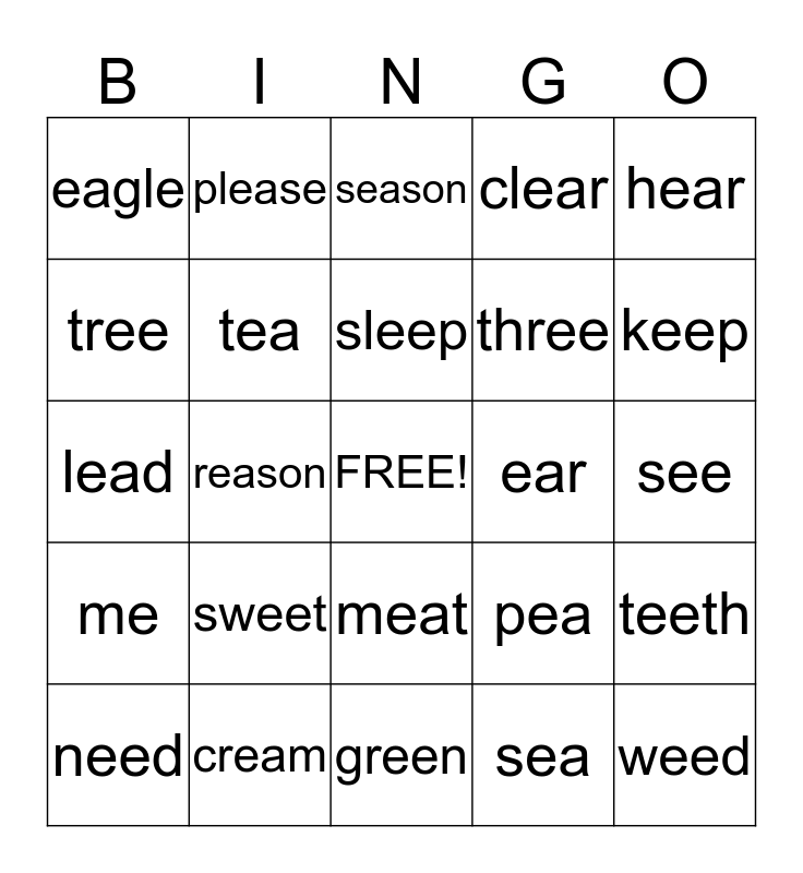 This bingo card has a free space and 24 words: sweet, cream, sleep, need, hear, eagle, tree, please, ear, meat, three, lead, pea, teeth, tea, sea, see, season, keep, reason, weed, me, clear and green.