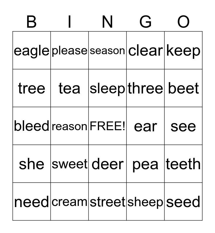 This bingo card has a free space and 24 words: sweet, cream, sleep, need, keep, eagle, tree, please, ear, deer, three, bleed, pea, teeth, tea, sheep, see, season, beet, reason, seed, she, clear and street.