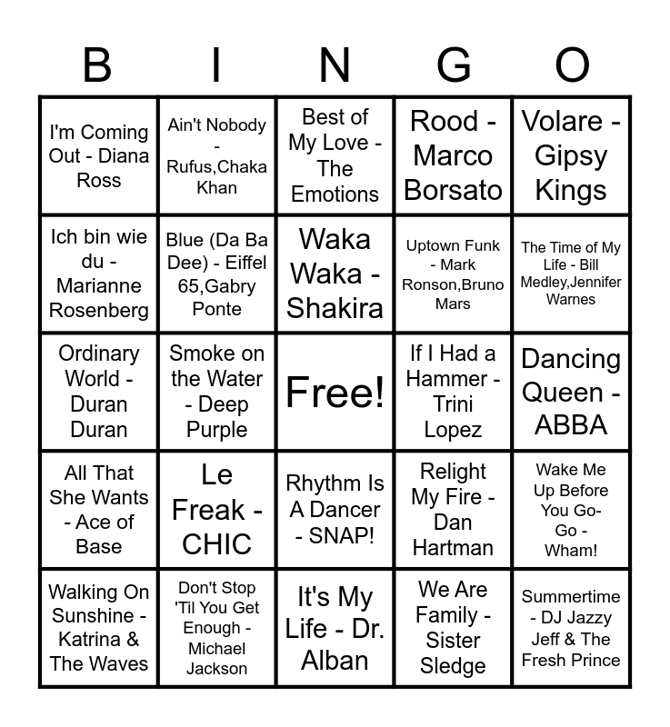 This bingo card has a free space and 60 words: What Is Love - Haddaway, Don't Stop 'Til You Get Enough - Michael Jackson, Gimme! Gimme! Gimme! (A Man After Midnight) - ABBA, All That She Wants - Ace of Base, We Are Family - Sister Sledge, The Final Countdown - Europe, Blue (Da Ba Dee) - Eiffel 65,Gabry Ponte, CAN'T STOP THE FEELING! (from TROLLS) - Justin Timberlake, Uptown Funk - Mark Ronson,Bruno Mars, Rainbow In The Sky - Paul Elstak, Rood - Marco Borsato, Hoe Het Danst - Marco Borsato,Armin van Buuren,Davina Michelle, Ich bin wie du - Marianne Rosenberg, I'm Still Standing - Elton John, Dancing On The Ceiling - Lionel Richie, I'm Coming Out - Diana Ross, Summertime - DJ Jazzy Jeff & The Fresh Prince, Volare - Gipsy Kings, Savage Love - Jawsh 685,Jason Derulo, Waka Waka - Shakira, If I Had a Hammer - Trini Lopez, Best of My Love - The Emotions, Walking On Sunshine - Katrina & The Waves, Wake Me Up Before You Go-Go - Wham!, Celebration - Kool & The Gang, Girls Just Want to Have Fun - Cyndi Lauper, Sexbomb - Tom Jones,Mousse T., Wannabe - Spice Girls, The Time of My Life - Bill Medley,Jennifer Warnes, Single Ladies - Beyoncé, It's Raining Men - The Weather Girls, Do You Love Me - The Contours, Nikita - Elton John, Chandelier - Sia, Ain't Nobody - Rufus,Chaka Khan, Kokomo - The Beach Boys, Brown Eyed Girl - Van Morrison, Smoke on the Water - Deep Purple, Beds Are Burning - Midnight Oil, Ordinary World - Duran Duran, Disco Inferno - The Trammps, Le Freak - CHIC, Dancing Queen - ABBA, Little Green Bag - George Baker Selection, Relight My Fire - Dan Hartman, Dance Little Sister - Terence Trent D'Arby, Bang Bang - Jessie J,Ariana Grande,Nicki Minaj, Let's Love - David Guetta,Sia, De Kapitein Deel II - Acda en de Munnik, Rhythm Is A Dancer - SNAP!, It's My Life - Dr. Alban, Paint It, Black - The Rolling Stones, In The Air Tonight - Phil Collins, 99 Luftballons - Nena, Nothing Else Matters - Metallica, Love Comes Again - Tiësto,BT, Ice Queen - Within Temptation, Sexy Als Ik Dans - Nielson, I'm Outta Love - Anastacia and You And Me - Spargo.
