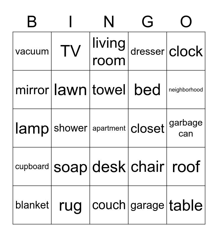 This bingo card has a free space and 24 words: soap, rug, towel, blanket, clock, vacuum, mirror, TV, closet, desk, bed, lamp, chair, roof, lawn, garage, garbage can, living room, neighborhood, shower, table, cupboard, dresser and couch.