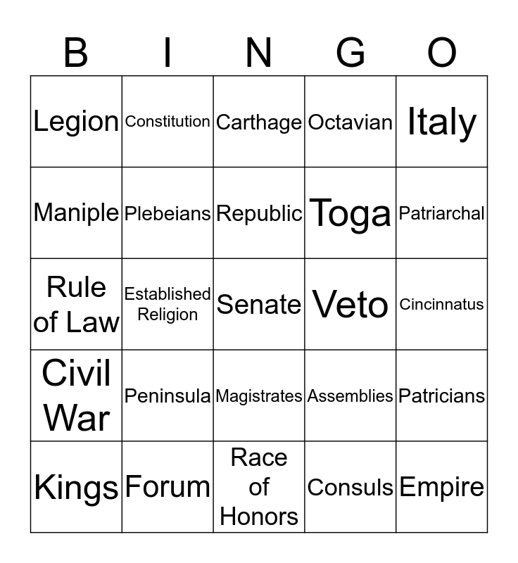 This bingo card has a free space and 24 words: Peninsula, Forum, Republic, Kings, Italy, Legion, Maniple, Constitution, Veto, Magistrates, Toga, Rule of Law, Assemblies, Patricians, Plebeians, Consuls, Cincinnatus, Carthage, Patriarchal, Established Religion, Empire, Civil War, Octavian and Race of Honors.
