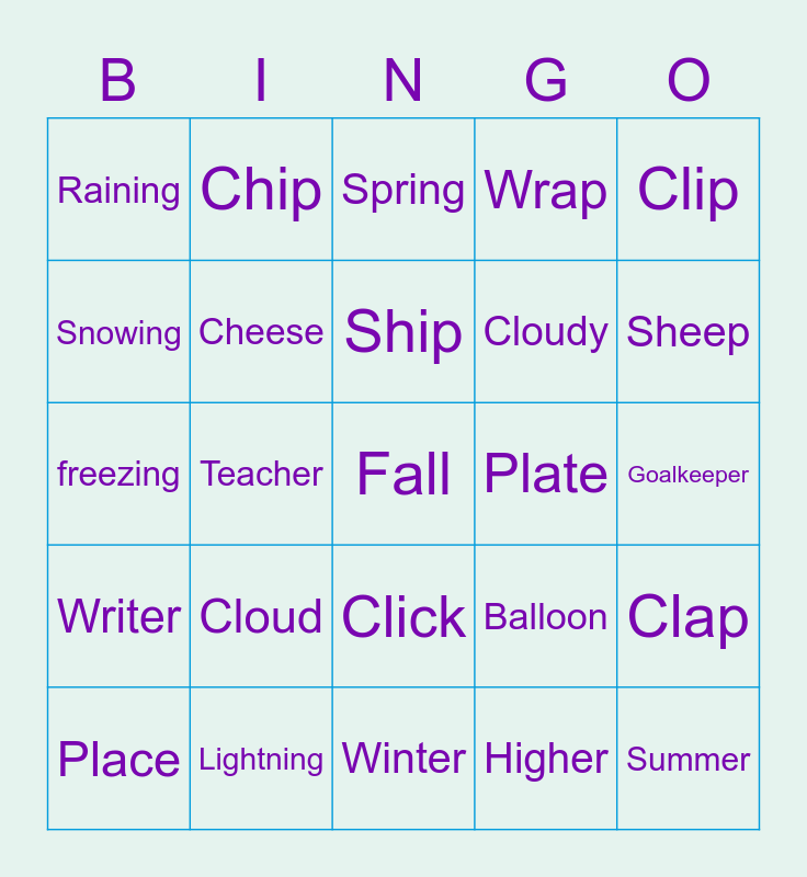 This bingo card has a free space and 24 words: Cloud, Lightning, Ship, Place, Clip, Raining, Snowing, Chip, Plate, Click, Cloudy, freezing, Balloon, Clap, Cheese, Higher, Goalkeeper, Spring, Sheep, Teacher, Summer, Writer, Wrap and Winter.