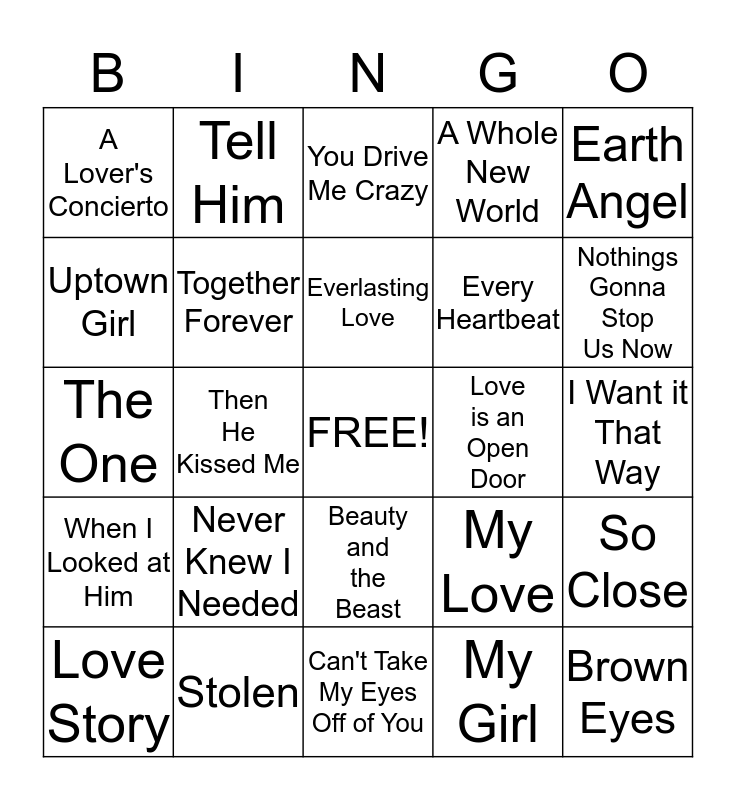 This bingo card has a free space and 24 words: Never Knew I Needed, Stolen, Everlasting Love, Love Story, Earth Angel, A Lover's Concierto, Uptown Girl, Tell Him, Love is an Open Door, Beauty and the Beast, Every Heartbeat, The One, My Love, So Close, Together Forever, My Girl, I Want it That Way, You Drive Me Crazy, Nothings Gonna Stop Us Now, Then He Kissed Me, Brown Eyes, When I Looked at Him, A Whole New World and Can't Take My Eyes Off of You.