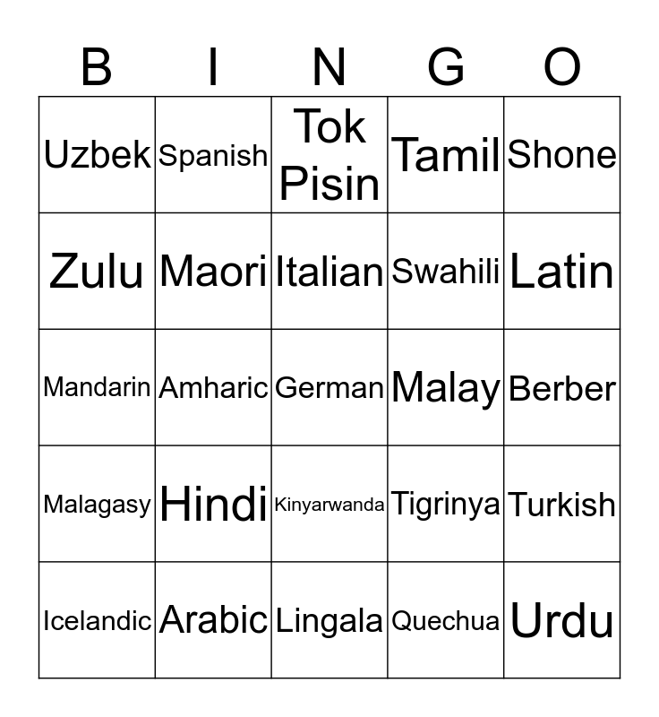 This bingo card has a free space and 24 words: Hindi, Arabic, Italian, Icelandic, Shone, Uzbek, Zulu, Spanish, Malay, Kinyarwanda, Swahili, Mandarin, Tigrinya, Turkish, Maori, Quechua, Berber, Tok Pisin, Latin, Amharic, Urdu, Malagasy, Tamil and Lingala.