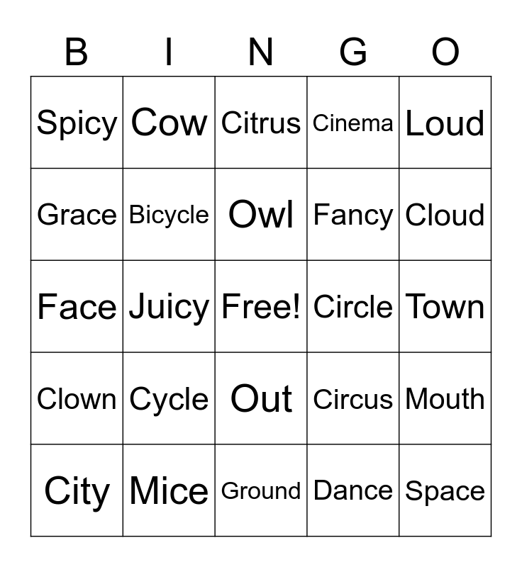 This bingo card has a free space and 24 words: Cycle, Mice, Owl, City, Loud, Spicy, Grace, Cow, Circle, Out, Fancy, Face, Circus, Mouth, Bicycle, Dance, Town, Citrus, Cloud, Juicy, Space, Clown, Cinema and Ground.