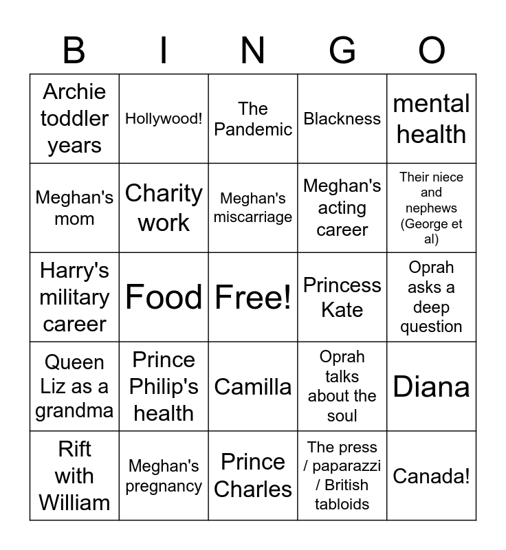 This bingo card has a free space and 24 words: Prince Philip's health, Meghan's pregnancy, Meghan's miscarriage, Rift with William, mental health, Archie toddler years, Meghan's mom, Hollywood!, Princess Kate, Camilla, Meghan's acting career, Harry's military career, Oprah talks about the soul, Diana, Charity work, The press / paparazzi / British tabloids, Oprah asks a deep question, The Pandemic, Their niece and nephews (George et al), Food, Canada!, Queen Liz as a grandma, Blackness and Prince Charles.
