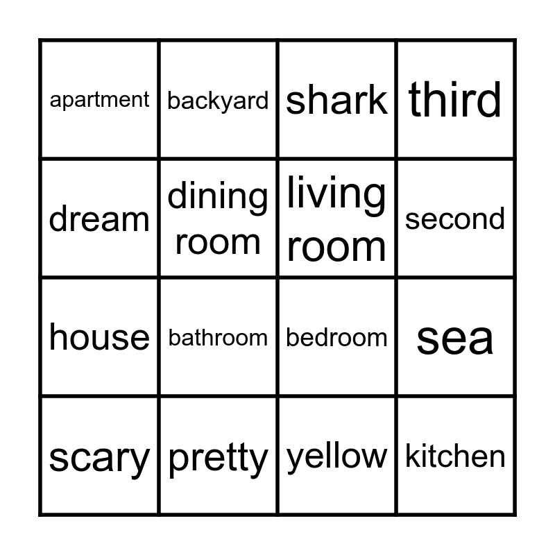 This bingo card has 20 words: sea, fish, shark, coral, scary, dream, pretty, apartment, house, backyard, bathroom, bedroom, dining room, kitchen, living room, first, second, third, yellow and pink.