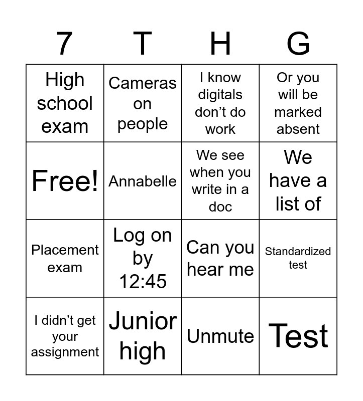 This bingo card has 16 words: Junior high, Standardized test, I know digitals don’t do work, High school exam, Placement exam, Cameras on people, Can you hear me, Unmute, Free!, Annabelle, I didn’t get your assignment, Or you will be marked absent, Log on by 12:45, We have a list of, We see when you write in a doc and Test.