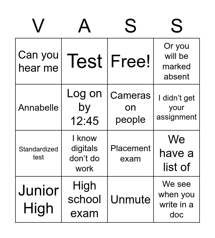 This bingo card has 16 words: High school exam, We have a list of, Free!, Can you hear me, Standardized test, Test, Placement exam, Unmute, Annabelle, Log on by 12:45, Junior High, Or you will be marked absent, I know digitals don’t do work, I didn’t get your assignment, Cameras on people and We see when you write in a doc.