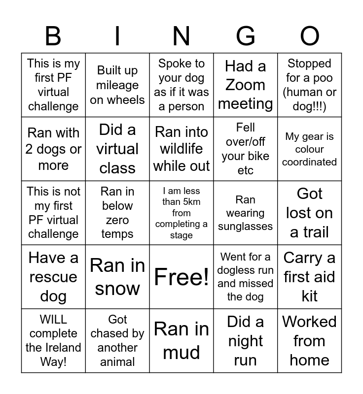This bingo card has 26 words: Free!, Did a night run, Ran into wildlife while out, Got chased by another animal, Stopped for a poo (human or dog!!!), This is my first PF virtual challenge, Ran with 2 dogs or more, Built up mileage on wheels, Got lost on a trail, Went for a dogless run and missed the dog, Fell over/off your bike etc, This is not my first PF virtual challenge, Carry a first aid kit, WILL complete the Ireland Way!, Ran in below zero temps, Ran a new trail, Had a Zoom meeting, Have a rescue dog, Spoke to your dog as if it was a person, I am less than 5km from completing a stage, My gear is colour coordinated, Ran in mud, Ran wearing sunglasses, Ran in snow, Did a virtual class and Worked from home.
