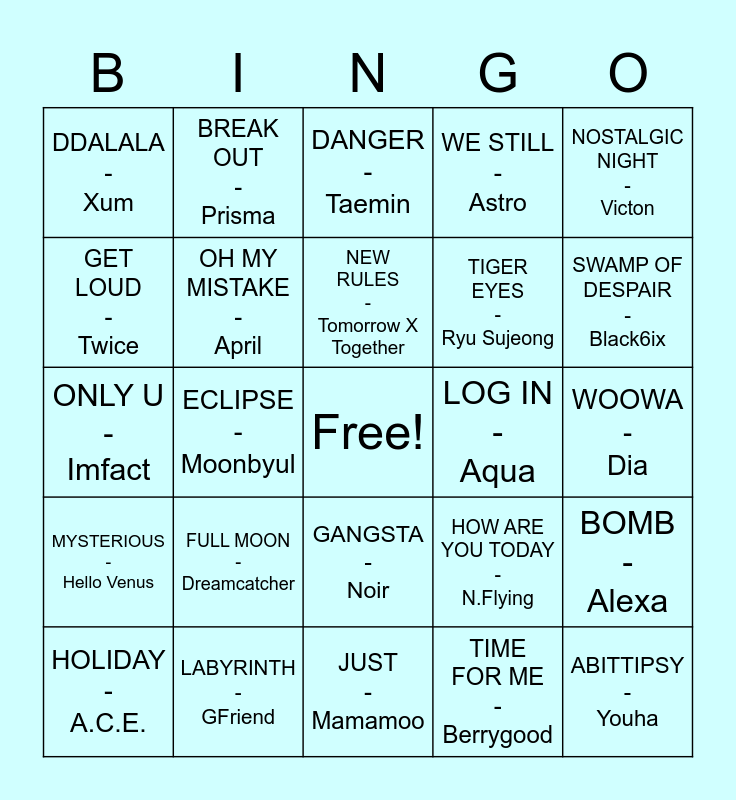 This bingo card has a free space and 24 words: FULL MOON - Dreamcatcher, LABYRINTH - GFriend, NEW RULES - Tomorrow X Together, HOLIDAY - A.C.E., NOSTALGIC NIGHT - Victon, DDALALA - Xum, GET LOUD - Twice, BREAK OUT - Prisma, LOG IN - Aqua, GANGSTA - Noir, TIGER EYES - Ryu Sujeong, ONLY U - Imfact, HOW ARE YOU TODAY - N.Flying, BOMB - Alexa, OH MY MISTAKE - April, TIME FOR ME - Berrygood, WOOWA - Dia, DANGER - Taemin, SWAMP OF DESPAIR - Black6ix, ECLIPSE - Moonbyul, ABITTIPSY - Youha, MYSTERIOUS - Hello Venus, WE STILL - Astro and JUST - Mamamoo.