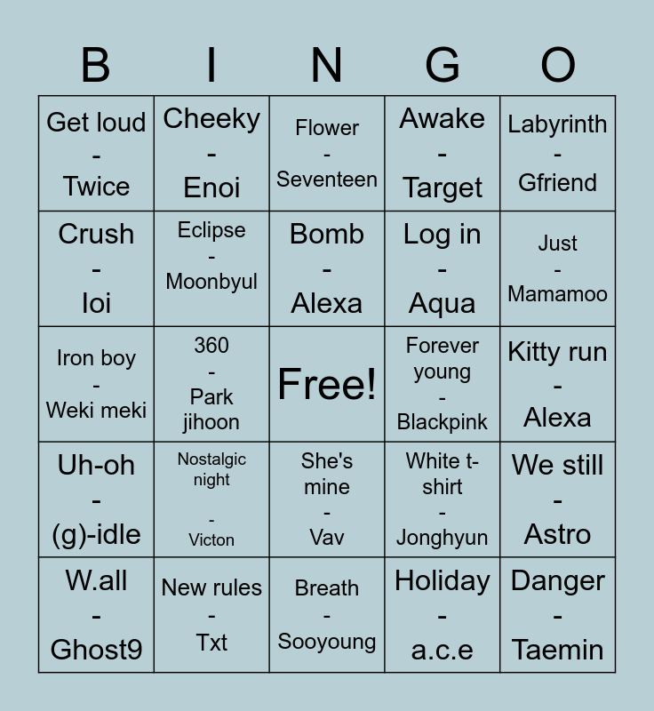 This bingo card has a free space and 24 words: Nostalgic night - Victon, New rules - Txt, Bomb - Alexa, W.all - Ghost9, Labyrinth - Gfriend, Get loud - Twice, Crush - Ioi, Cheeky - Enoi, Forever young - Blackpink, She's mine - Vav, Log in - Aqua, Iron boy - Weki meki, White t-shirt - Jonghyun, We still - Astro, Eclipse - Moonbyul, Holiday - a.c.e, Kitty run - Alexa, Flower - Seventeen, Just - Mamamoo, 360 - Park jihoon, Danger - Taemin, Uh-oh - (g)-idle, Awake - Target and Breath - Sooyoung.