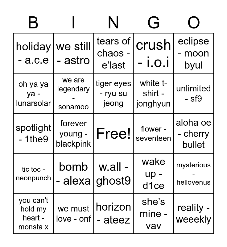 This bingo card has a free space and 37 words: abittipsy - youha, log in - aqua, full moon - dreamcatcher, we are legendary - sonamoo, mysterious - hellovenus, bomb - alexa, tiger eyes - ryu su jeong, iron boy - weki meki, eclipse - moon byul, destiny - lovelyz, forever young - blackpink, crush - i.o.i, reality - weeekly, aloha oe - cherry bullet, oh ya ya ya - lunarsolar, tic toc - neonpunch, our garden - wjsn, tears of chaos - e’last, w.all - ghost9, flower - seventeen, holiday - a.c.e, unlimited - sf9, you can't hold my heart - monsta x, horizon - ateez, black out - cix, she’s mine - vav, we still - astro, nostalgic night - victon, 360 - park ji hoon, gangsta - noir, danger - taemin, we must love - onf, spotlight - 1the9, regulus - onewe, wake up - d1ce, white t-shirt - jonghyun and new rules - tomorrow x together.