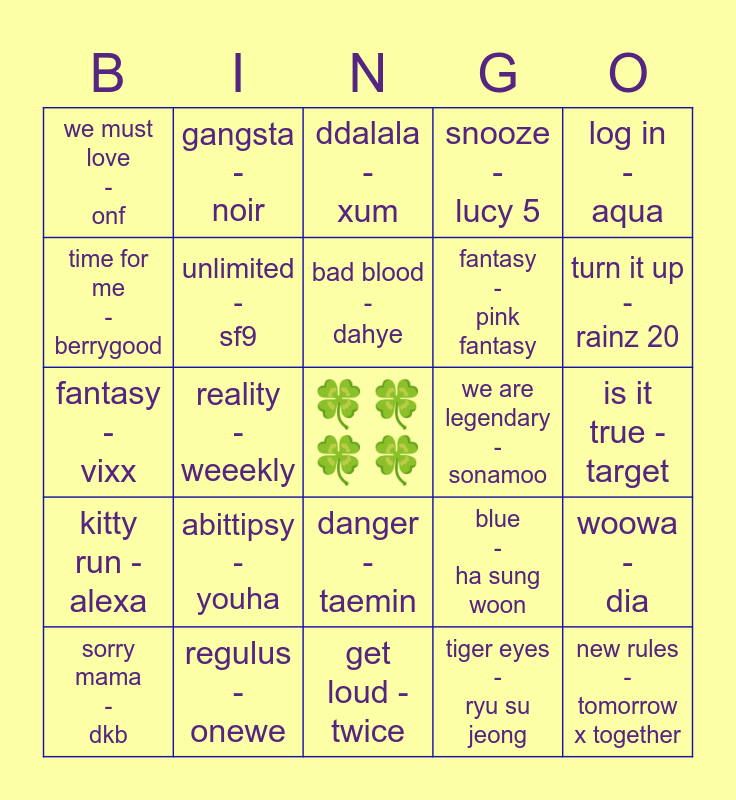This bingo card has a free space and 24 words: abittipsy - youha, regulus - onewe, bad blood - dahye, sorry mama - dkb, log in - aqua, we must love - onf, time for me - berrygood, gangsta - noir, we are legendary - sonamoo, danger - taemin, fantasy - pink fantasy, fantasy - vixx, blue - ha sung woon, woowa - dia, unlimited - sf9, tiger eyes - ryu su jeong, is it true - target, ddalala - xum, turn it up - rainz 20, reality - weeekly, new rules - tomorrow x together, kitty run - alexa, snooze - lucy 5 and get loud - twice.