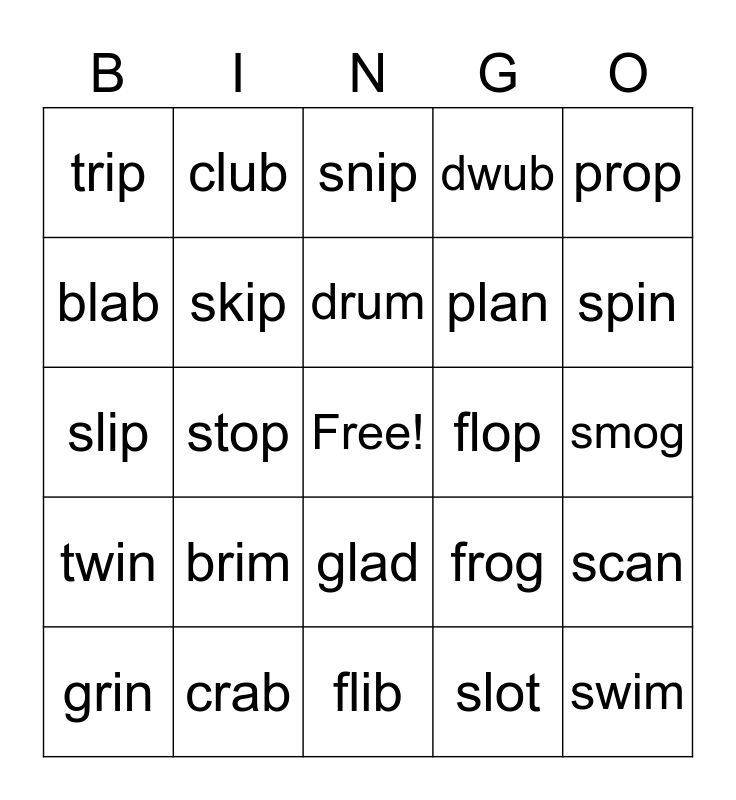 This bingo card has a free space and 24 words: brim, crab, drum, grin, prop, trip, blab, club, flop, glad, plan, slip, frog, scan, skip, slot, smog, snip, spin, stop, swim, twin, dwub and flib.