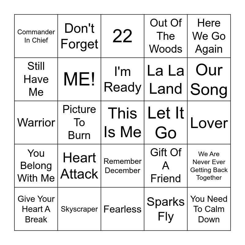 This bingo card has a free space and 24 words: Heart Attack, Skyscraper, I'm Ready, Give Your Heart A Break, Here We Go Again, Commander In Chief, Still Have Me, Don't Forget, Let It Go, Remember December, La La Land, Warrior, Gift Of A Friend, We Are Never Ever Getting Back Together, ME!, Sparks Fly, Lover, 22, Our Song, Picture To Burn, You Need To Calm Down, You Belong With Me, Out Of The Woods and Fearless.