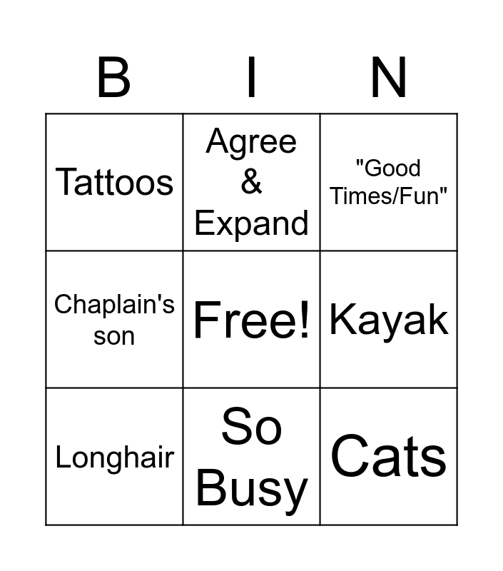 This bingo card has a free space and 8 words: Kayak, "Good Times/Fun", Agree & Expand, Longhair, Tattoos, Cats, Chaplain's son and So Busy.