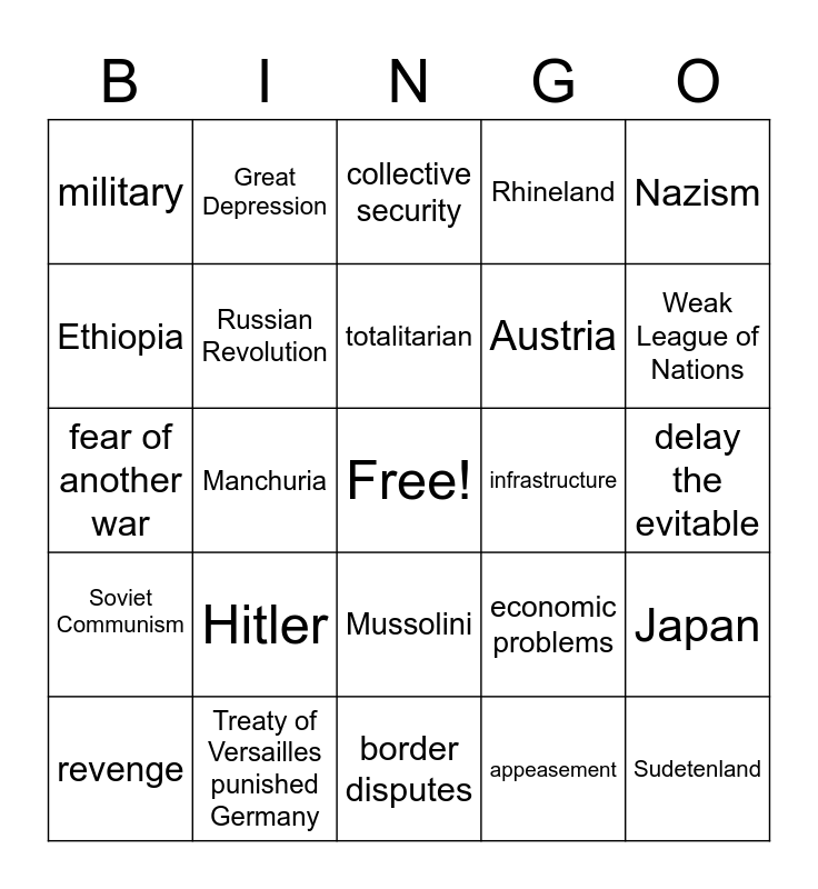 This bingo card has a free space and 34 words: Consequences, appeasement, weak governments, Fascism, Soviet Communism, Russian Revolution, Nazism, revenge, Great Depression, aggression, totalitarian, collective security, Nazi expansion, ideology, infrastructure, Weak League of Nations, Treaty of Versailles punished Germany, fear of another war, Hitler, economic problems, Mussolini, distrust, military, delay the evitable, border disputes, Sudetenland, Rhineland, Czechoslovakia, Austria, Ethiopia, democracy, Manchuria, Japan and China.