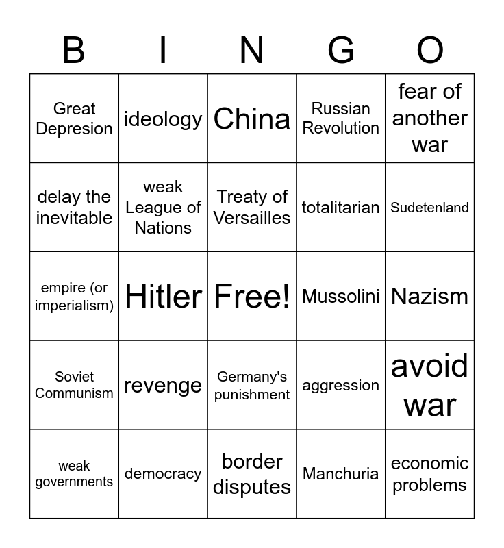 This bingo card has a free space and 39 words: consequences, infrastructure, appeasement, weak League of Nations, weak governments, Germany's punishment, Treaty of Versailles, Fascism, fear of another war, Soviet Communism, Hitler, Russian Revolution, economic problems, Nazism, Mussolini, revenge, distrust, Great Depresion, military, aggression, delay the inevitable, border disputes, totalitarian, Sudetenland, Rhineland, collective security, Austria, Nazi expansion, Ethiopia, ideology, Czechoslovakia, Japan, China, democracy, Manchuria, nationalism, avoid war, empire (or imperialism) and competition.