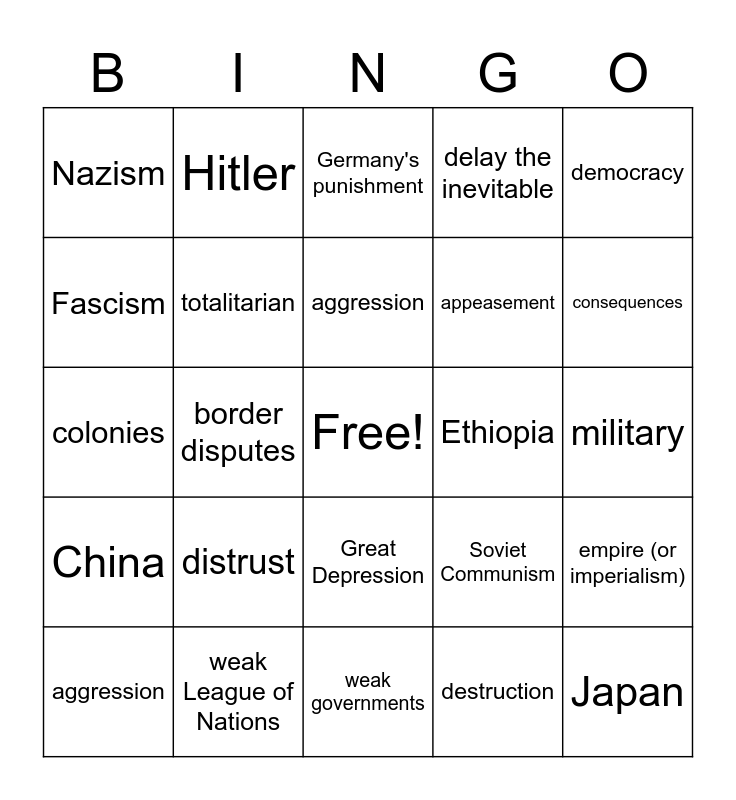 This bingo card has a free space and 39 words: ideology, Nazi expansion, collective security, totalitarian, aggression, Great Depression, aggression, revenge, democracy, China, border disputes, delay the inevitable, Japan, military, Ethiopia, distrust, Rhineland, Nazism, Russian Revolution, Soviet Communism, Fascism, weak governments, appeasement, consequences, Czechoslovakia, Sudetenland, Austria, Mussolini, economic problems, Hitler, fear of another war, Treaty of Versailles, Germany's punishment, weak League of Nations, destruction, infrastructure, empire (or imperialism), colonies and reparations.