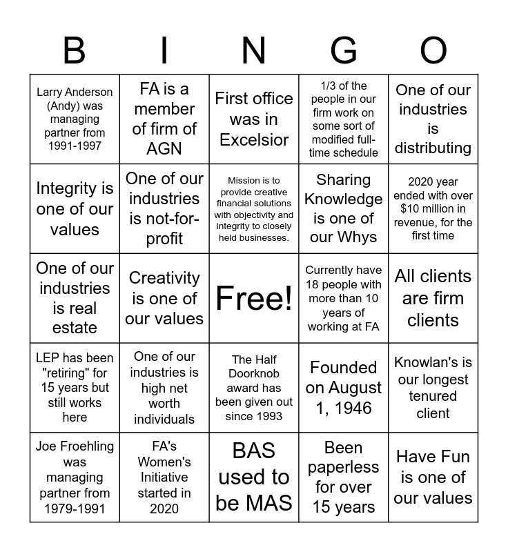 This bingo card has a free space and 75 words: Joe Froehling, a namesake, is a client, 11 partners have served and retired from the firm, First office was in Excelsior, Has had a marketing professional in the firm for 25 years, There are 6 people celebrating 15 years in 2021, Has been consulting with clients for the full 75 years, Had their first remote employee in 2006, Has had an internship program for 30 years, Has had a female partner since 1994, In 2019 - had two employees celebrating their 40th anniversary, In 2007, officially changed their name to Froehling Anderson LTD., FA has won Best Places to Work 3 times, Mission is to provide creative financial solutions with objectivity and integrity to closely held businesses., Integrity is one of our values, Objectivity is one of our values, Creativity is one of our values, Provide Solutions is one of our values, Have Fun is one of our values, One of our industries is professional athletes, One of our industries is distributing, One of our industries is professional services, One of our industries is real estate, One of our industries is not-for-profit, FA is a member of firm of AGN, 1/3 of the people in our firm work on some sort of modified full-time schedule, Started by Bud Long as M.J. Long Co, Long, Froehling & Assoc was a previous name, Froehling, Anderson, Plowman & Egnell was a previous name, Froehling, Anderson, Plowman & Wasmuth was a previous name, Dave Benusa has been the managing partner since 2011, FA has had 6 managing partners, Team Cobalt represents our internal culture, FA has been a member of AGN for 14 years, Founded on August 1, 1946, 2020 year ended with over $10 million in revenue, for the first time, Sharing Knowledge is one of our Whys, Collaborating Solutions is one of our Whys, Nurturing Success is one of our Whys, All clients are firm clients, Been paperless for over 15 years, We have a culture of learning, #1 employee description of firm is FUN, #2 employee description of firm is PROFESSIONAL, Summer half day Fridays since 2007, We've done DiSC since 2013, M.J. Long (Bud) was managing partner from 1946-1979, Joe Froehling was managing partner from 1979-1991, Larry Anderson (Andy) was managing partner from 1991-1997, Dave Wasmuth was managing partner from 1997-2004, Doug Galka was managing partner from 2004-2011, The Doorknob award has been given out since 1987, The Half Doorknob award has been given out since 1993, Office moved Opus Park in Minnetonka in 1997, Office moved to Shelard Parkway in St. Louis Park in 2007, Office moved to MetroPoint in St. Louis Park in 2016, In 2021, the firm has 12 partners, FA has its second female partner in 2005, In 1980s, FA offered Computer Consulting Services, One of our industries is manufacturing, One of our industries is Construction, One of our industries is high net worth individuals, One of our industries is professional athletes, FA will host AGN's NARM in Minneapolis in 2022, Originally had 3 computers in one room that had to shared, Put a personal computer on every desk in the early 1990s, Currently have 18 people with more than 10 years of working at FA, 8 people are celebrating their 5 year anniversary in 2021, "Putting people before the numbers" has been in our marketing since the 1990s, Our conference rooms are named after our core values, Knowlan's is our longest tenured client, LEP has been "retiring" for 15 years but still works here, FA's Women's Initiative started in 2020, GSD started in 2004, BAS used to be MAS and The partners have done turkey dinner for the firm for 28 years.