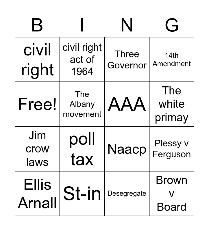 This bingo card has 16 words: St-in, Plessy v Ferguson, Three Governor, civil right, Jim crow laws, civil right act of 1964, Naacp, Desegregate, Free!, The Albany movement, Ellis Arnall, 14th Amendment, poll tax, The white primay, AAA and Brown v Board.