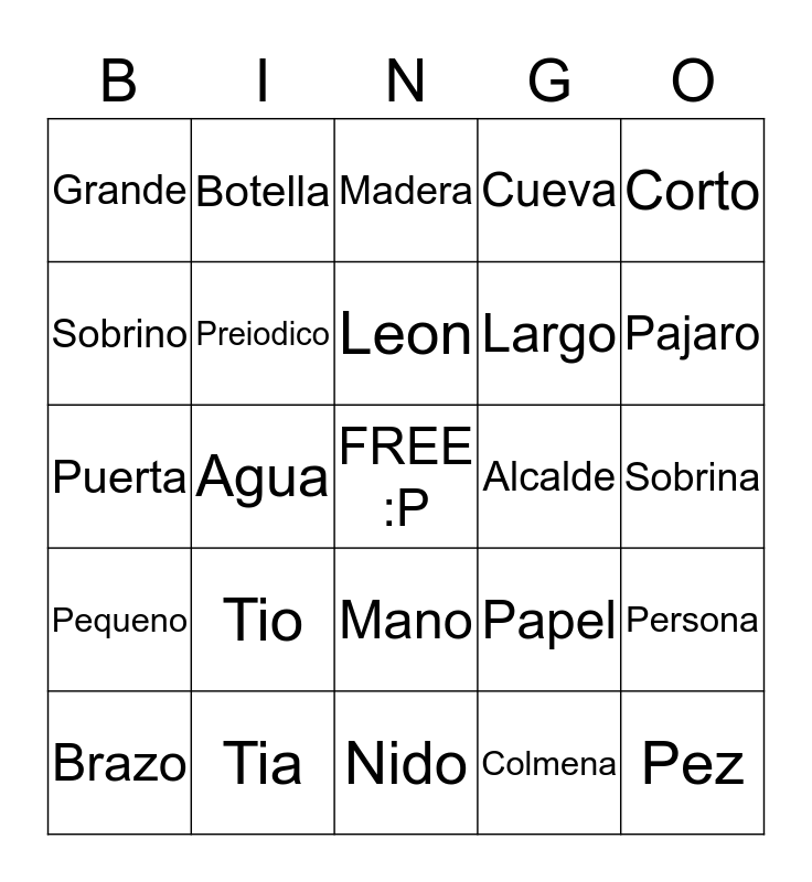 This bingo card has a free space and 24 words: Tio, Tia, Leon, Brazo, Corto, Grande, Sobrino, Botella, Alcalde, Mano, Largo, Puerta, Papel, Persona, Preiodico, Colmena, Sobrina, Madera, Pajaro, Agua, Pez, Pequeno, Cueva and Nido.