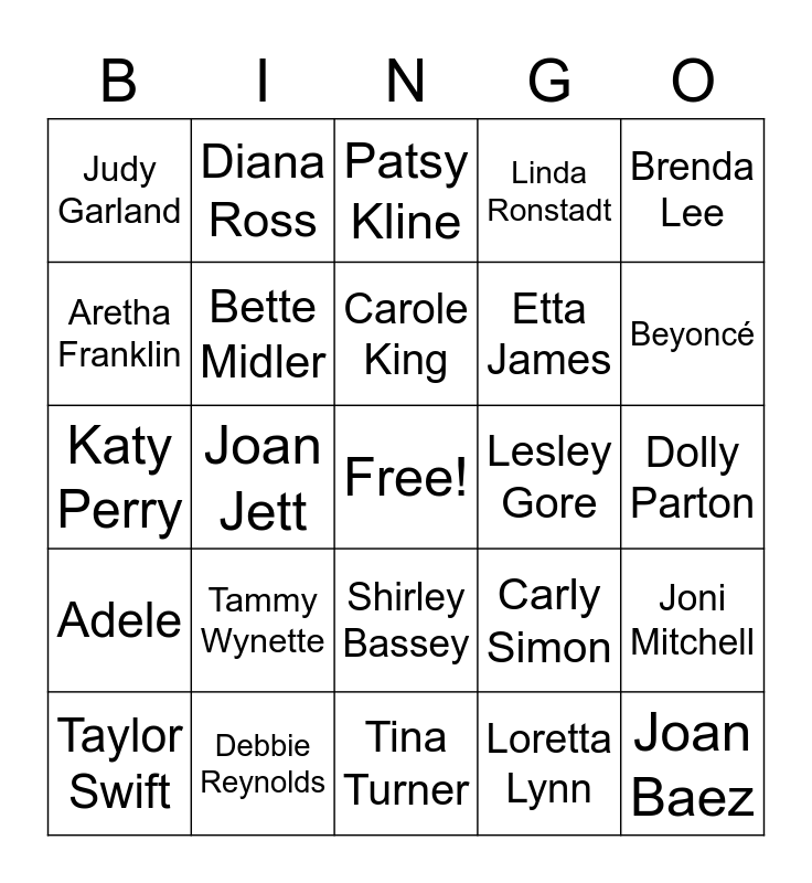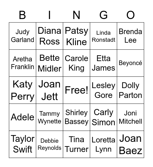 This bingo card has a free space and 24 words: Tammy Wynette, Debbie Reynolds, Carole King, Taylor Swift, Brenda Lee, Judy Garland, Aretha Franklin, Diana Ross, Lesley Gore, Shirley Bassey, Etta James, Katy Perry, Carly Simon, Joni Mitchell, Bette Midler, Loretta Lynn, Dolly Parton, Patsy Kline, Beyoncé, Joan Jett, Joan Baez, Adele, Linda Ronstadt and Tina Turner.