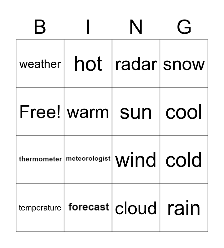 This bingo card has 3 images and 13 words: cold, radar, weather, hot, wind, cloud, Free!, warm, temperature, snow, cool, sun and rain.