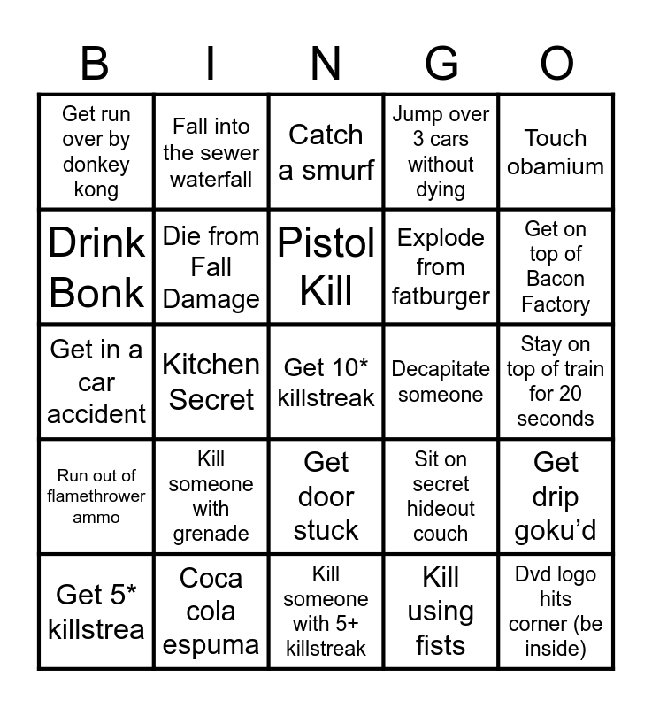 This bingo card has a free space and 24 words: Kill someone with grenade, Coca cola espuma, Pistol Kill, Get 5* killstrea, Touch obamium, Get run over by donkey kong, Drink Bonk, Fall into the sewer waterfall, Decapitate someone, Get door stuck, Explode from fatburger, Get in a car accident, Sit on secret hideout couch, Get drip goku’d, Die from Fall Damage, Kill using fists, Stay on top of train for 20 seconds, Catch a smurf, Get on top of Bacon Factory, Kitchen Secret, Dvd logo hits corner (be inside), Run out of flamethrower ammo, Jump over 3 cars without dying and Kill someone with 5+ killstreak.
