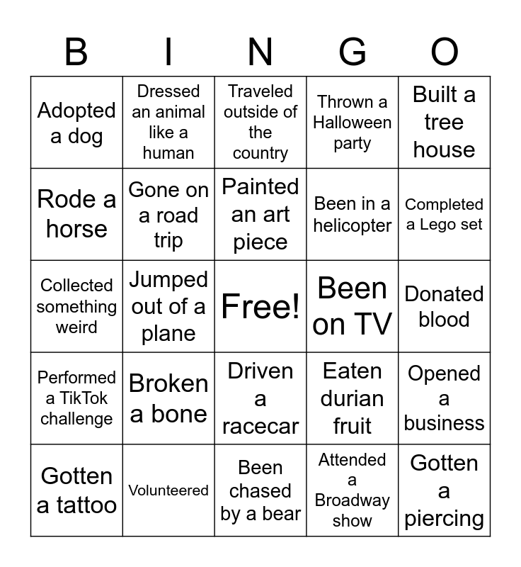 This bingo card has a free space and 29 words: Gotten a tattoo, Swam with dolphins, Jumped out of a plane, Gotten married, Adopted a dog, Traveled outside of the country, Gone on a road trip, Broken a bone, Been on TV, Volunteered, Donated blood, Gotten a piercing, Been chased by a bear, Attended a Broadway show, Completed a Lego set, Competed in a marathon, Driven a racecar, Performed a TikTok challenge, Built a tree house, Collected something weird, Eaten durian fruit, Climbed a mountain, Been in a helicopter, Rode a horse, Thrown a Halloween party, Dressed an animal like a human, Opened a business, Painted an art piece and Dyed your hair a different color.