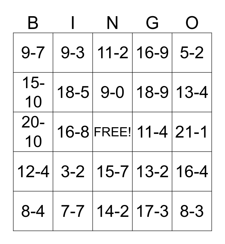 This bingo card has a free space and 24 words: 3-2, 7-7, 9-0, 8-4, 5-2, 9-7, 15-10, 9-3, 11-4, 15-7, 18-9, 20-10, 13-2, 16-4, 18-5, 17-3, 21-1, 11-2, 13-4, 16-8, 8-3, 12-4, 16-9 and 14-2.