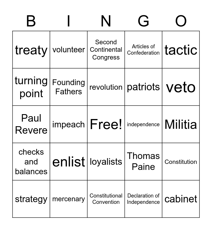 This bingo card has a free space and 24 words: enlist, mercenary, revolution, strategy, tactic, treaty, turning point, volunteer, independence, loyalists, patriots, Paul Revere, Thomas Paine, Constitution, Founding Fathers, Declaration of Independence, Militia, Second Continental Congress, veto, impeach, cabinet, checks and balances, Articles of Confederation and Constitutional Convention.