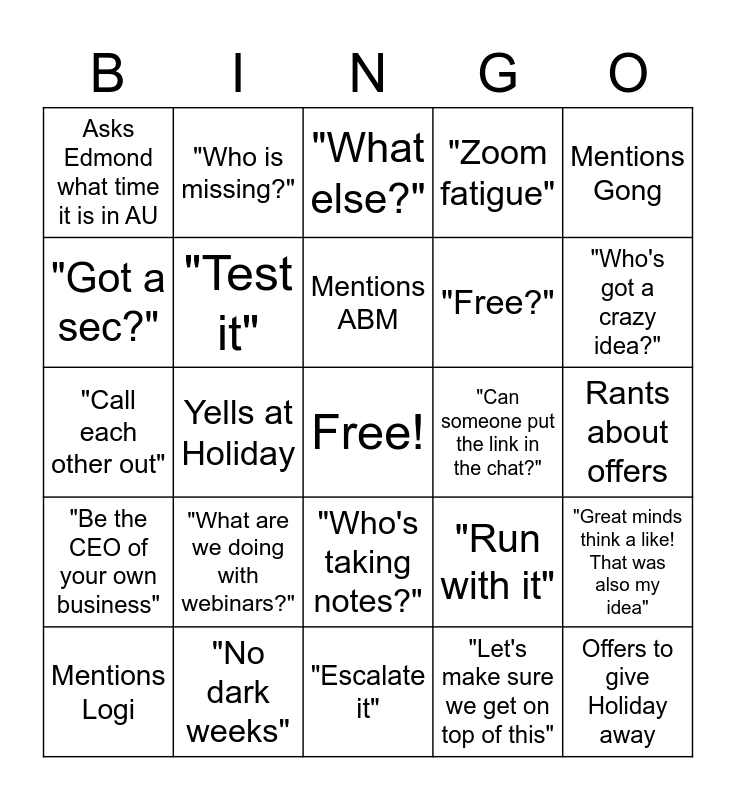 This bingo card has a free space and 30 words: "No dark weeks", "Dig into the data", Yells at Holiday, Hates on Holiday, Asks Edmond what time it is in AU, "What else?", "Test it", "Who's taking notes?", "Can someone put the link in the chat?", "Escalate it", Rants about offers, Offers to give Holiday away, "Let's make sure we get on top of this", "It doesn't need to be perfect", "Who's got a crazy idea?", Mentions crossfit, "Run with it", "Be the CEO of your own business", "What are we doing with webinars?", Mentions Gong, "Call each other out", "Raise your hand. We can get a freelancer", "Who is missing?", "Free?", "Got a sec?", "Zoom fatigue", "Great minds think a like! That was also my idea", Mentions Logi, Mentions ABM and "Outsource it".