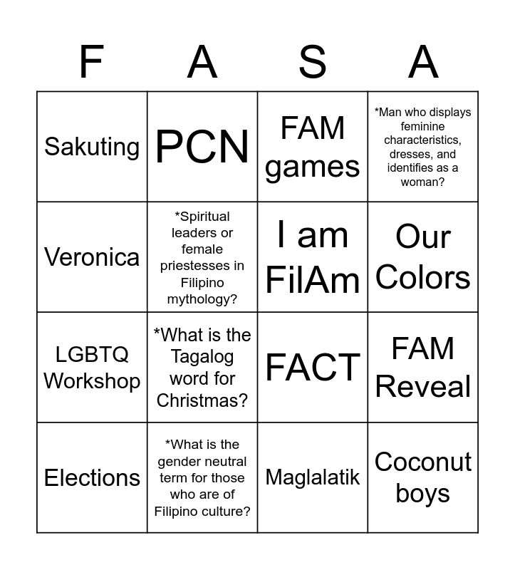 This bingo card has 33 words: Reno Ursal, Battle of Ba Sing Se, FAM Reveal, *What did the finance committee eat to raise money for PCN?, Coconut boys, I am FilAm, Veronica, *What charity is PCN raising money for?, PCN, Tinikling on the diag, Our Colors, FAM games, Pokemon cards, Fanfictions, *What is the gender neutral term for those who are of Filipino culture?, *What is the Tagalog word for Christmas?, Jeopardy, FACT, Crossy Road Competition, Open Mic Night, Performance Showcase, *The #1 billboard song this year!!!???, Sakuting, Maglalatik, Modern, Elections, *Man who displays feminine characteristics, dresses, and identifies as a woman?, LGBTQ Workshop, *Spiritual leaders or female priestesses in Filipino mythology?, (QUIZ) Washed rice or unwashed rice?, (QUIZ) Pork sisig or Chicken Adobo or Kare-kare or Bistek or Bulalo?, Battle of the Bamboo and Ricebowl.