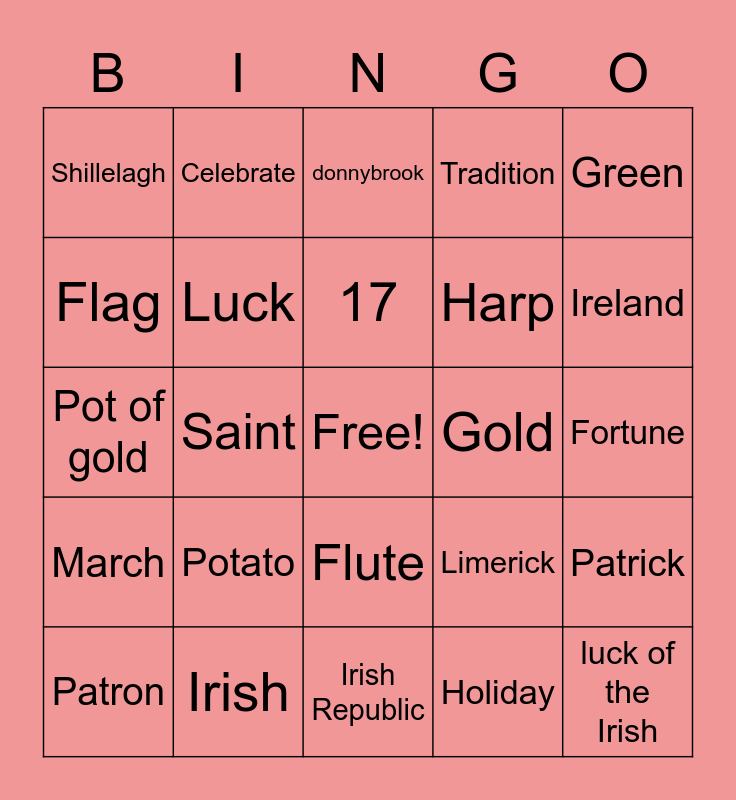This bingo card has a free space and 37 words: Rainbow, Leprechaun, Magic, Gold, Fortune, March, Saint, Clover, Harp, Mischief, Flag, Luck, Holiday, Green, Shillelagh, Irish, Flute, Tradition, Ireland, Pot of gold, Celebrate, 17, Mischievous, Patrick, legend, shamrock, donnybrook, Emerald Isle, four-leaf clover, Gaelic, Hibernian, Irish Republic, Limerick, luck of the Irish, Patron, Potato and St. Paddy's Day.
