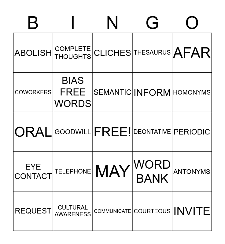 This bingo card has a free space and 24 words: TELEPHONE, CULTURAL AWARENESS, SEMANTIC, REQUEST, AFAR, ABOLISH, COWORKERS, COMPLETE THOUGHTS, DEONTATIVE, MAY, INFORM, ORAL, WORD BANK, ANTONYMS, BIAS FREE WORDS, COURTEOUS, PERIODIC, CLICHES, HOMONYMS, GOODWILL, INVITE, EYE CONTACT, THESAURUS and COMMUNICATE.