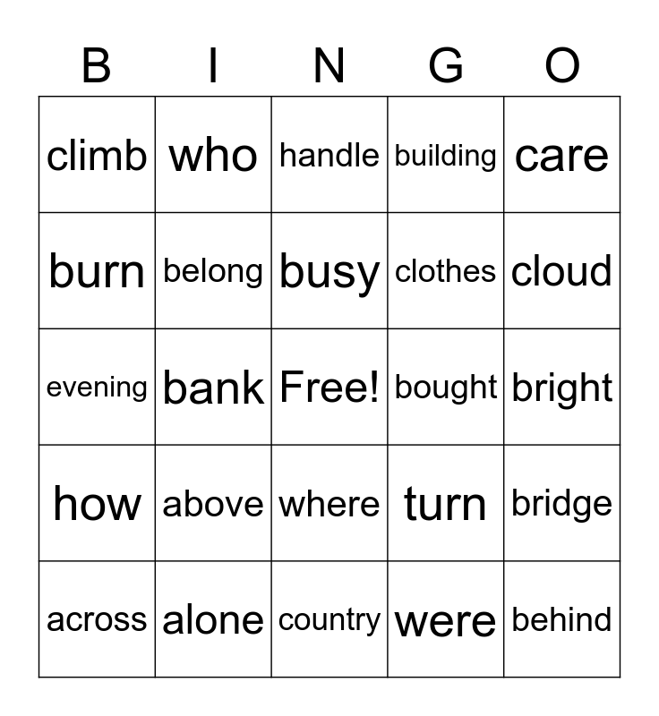 This bingo card has a free space and 24 words: above, alone, busy, across, care, climb, burn, who, bought, where, clothes, evening, turn, bridge, belong, were, bright, handle, cloud, bank, behind, how, building and country.