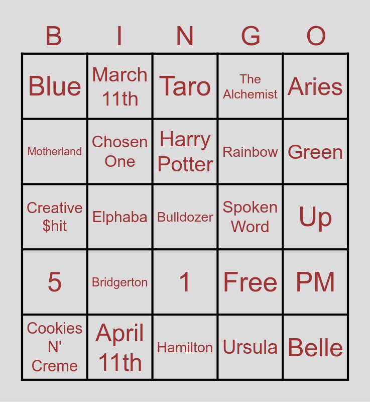 This bingo card has 25 words: Bridgerton, Hamilton, Harry Potter, Cookies N' Creme, Aries, Blue, Motherland, March 11th, Spoken Word, 1, Rainbow, Creative $hit, Free, PM, Chosen One, Belle, Up, Taro, Green, Elphaba, Bulldozer, April 11th, 5, The Alchemist and Ursula.