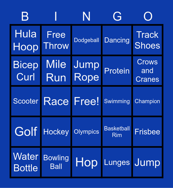 This bingo card has a free space and 24 words: Hockey, Bowling Ball, Jump Rope, Water Bottle, Track Shoes, Hula Hoop, Bicep Curl, Free Throw, Swimming, Olympics, Protein, Scooter, Basketball Rim, Frisbee, Mile Run, Lunges, Champion, Dodgeball, Crows and Cranes, Race, Jump, Golf, Dancing and Hop.