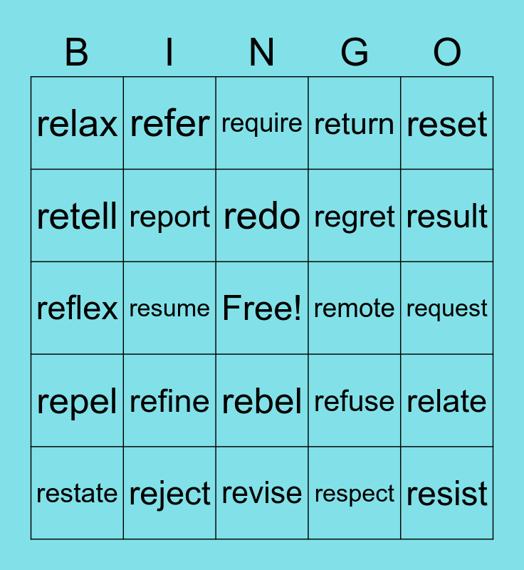 This bingo card has a free space and 24 words: refine, reject, redo, restate, reset, relax, retell, refer, remote, rebel, regret, reflex, refuse, relate, report, respect, request, require, result, resume, resist, repel, return and revise.