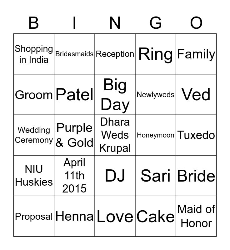 This bingo card has a free space and 24 words: April 11th 2015, Henna, Big Day, Proposal, Family, Shopping in India, Groom, Bridesmaids, Honeymoon, DJ, Newlyweds, Wedding Ceremony, Sari, Bride, Patel, Cake, Tuxedo, Reception, Ved, Purple & Gold, Maid of Honor, NIU Huskies, Ring and Love.