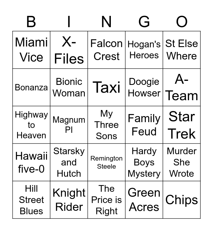 This bingo card has a free space and 27 words: Hardy Boys Mystery, Rockford Files, Doogie Howser, The Price is Right, Bonanza, Falcon Crest, X-Files, Hawaii five-0, Family Feud, Murder She Wrote, Highway to Heaven, Hogan's Heroes, Hill Street Blues, Knight Rider, A-Team, That Girl, Bionic Woman, Taxi, Starsky and Hutch, Miami Vice, Star Trek, Green Acres, Magnum PI, Chips, Remington Steele, St Else Where and The Waltons.