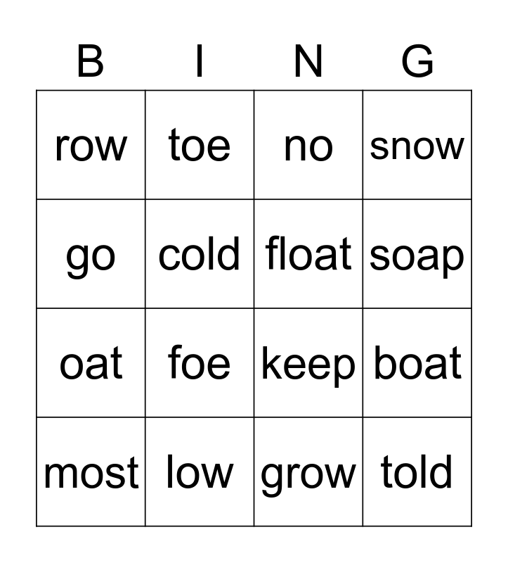 This bingo card has 16 words: low, boat, no, row, oat, toe, keep, grow, go, cold, most, snow, foe, soap, float and told.