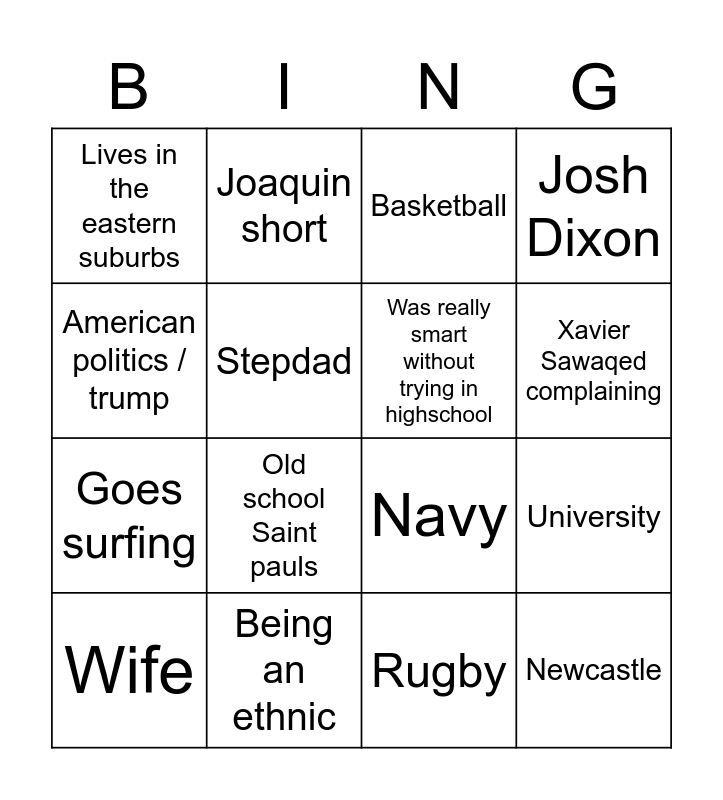 This bingo card has 19 words: Navy, Childhood family life, Basketball, Newcastle, University, American politics / trump, Rugby, Lives in the eastern suburbs, Joaquin short, Goes surfing, Old school Saint pauls, Stepdad, Was really smart without trying in highschool, Being an ethnic, Wife, Tattoos, Josh Dixon, Xavier Sawaqed complaining and "kids these days".