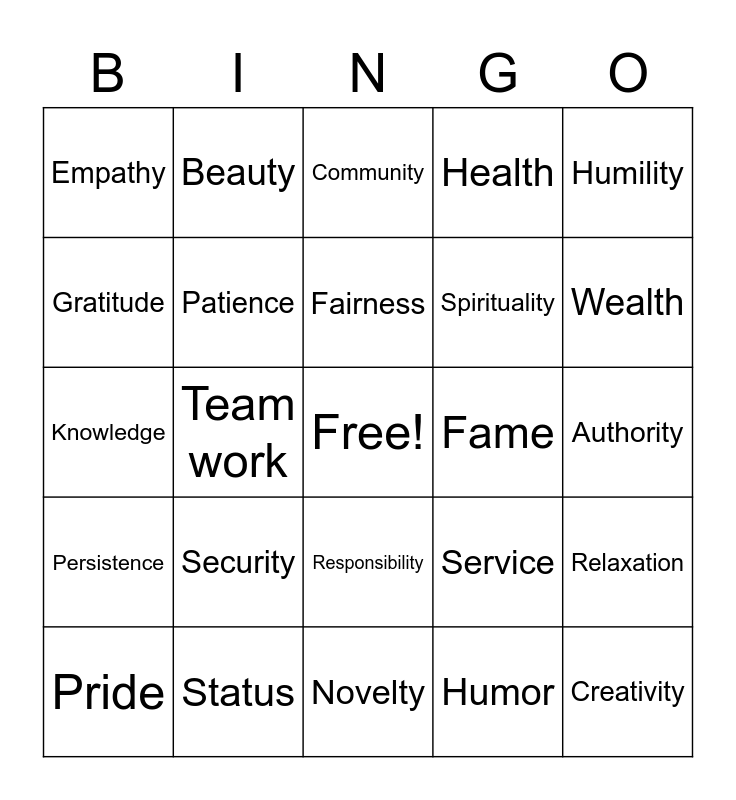 This bingo card has a free space and 34 words: Adventure, Humor, Freedom, Justice, Persistence, Patience, Humility, Pride, Beauty, Care, Fairness, Community, Tradition, Tolerance, Fame, Wealth, Status, Knowledge, Security, Service, Responsibility, Honesty, Empathy, Authority, Novelty, Creativity, Health, Popularity, Spirituality, Gratitude, Leadership, Team work, Relaxation and Hard work.