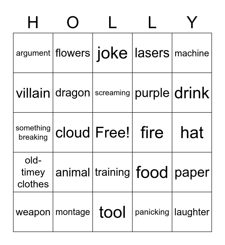 This bingo card has a free space and 24 words: animal, montage, screaming, weapon, machine, argument, villain, flowers, fire, training, purple, something breaking, food, paper, dragon, panicking, hat, joke, drink, cloud, laughter, old-timey clothes, lasers and tool.