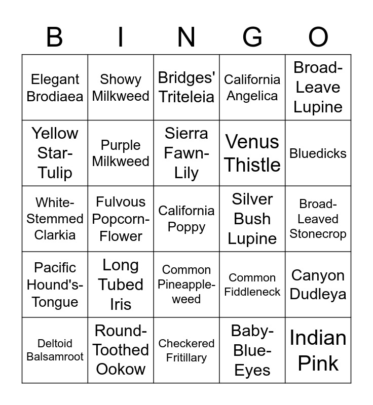 This bingo card has a free space and 39 words: Milkmaids, Pacific Sanicle, California Pipevine Yarrow, Purple Milkweed, Deltoid Balsamroot, Common Pineapple-weed, Sierra Fawn-Lily, Foothill Gumplant, Broad-Leave Lupine, Pacific Hound's-Tongue, Fulvous Popcorn-Flower, California Angelica, Indian Pink, Broad-Leaved Stonecrop, Silver Bush Lupine, Long Tubed Iris, Variable-Leaved Nemophila, Elegant Brodiaea, Twining Ookow, Common Fiddleneck, Yellow Star-Tulip, Checkered Fritillary, Venus Thistle, Bluedicks, Ithuriel's-Spear, Stream Orchid, Sulphur Pea, Indian Rhubarb, Western Buttercup, Showy Milkweed, Royal Larkspur, Seep Monkey-Flower, Bridges' Triteleia, Round-Toothed Ookow, Baby-Blue-Eyes, California Rose, Canyon Dudleya, White-Stemmed Clarkia and Purple Sanicle.